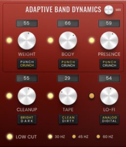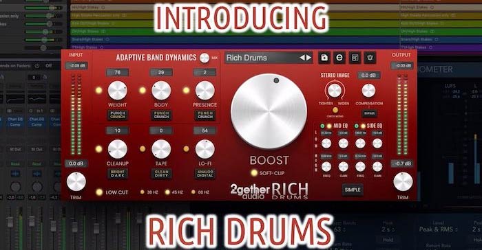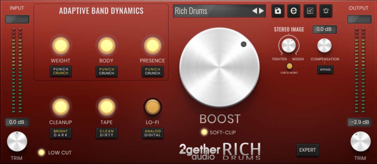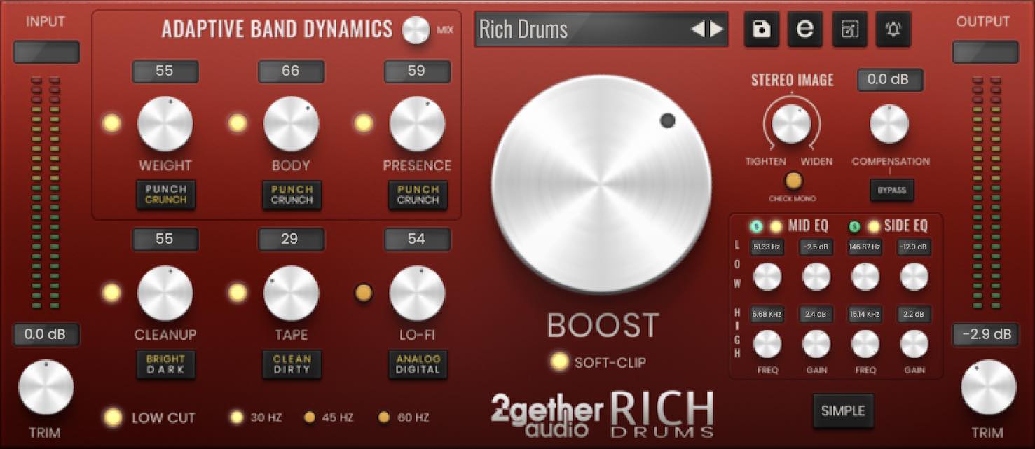 RICH Drums uses a proprietary Adaptive Band Dynamics circuit to carefully shape the loudness of your stereo drum mix.