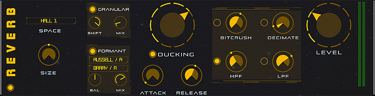 Not your grandma’s reverb. SPACE DUCK features 27 impulse responses alongside bit crushing, decimation, granular and filter effects. Take your reverb to a whole new universe.