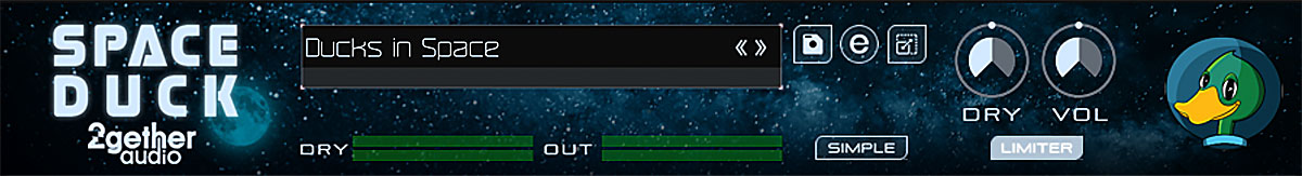 100 factory presets will get your creativity flowing as well as demonstrate the power of SPACE DUCK for your production. Add to that a dedicated dry control, built-in limiter, multiple display sizes and an animated duck.