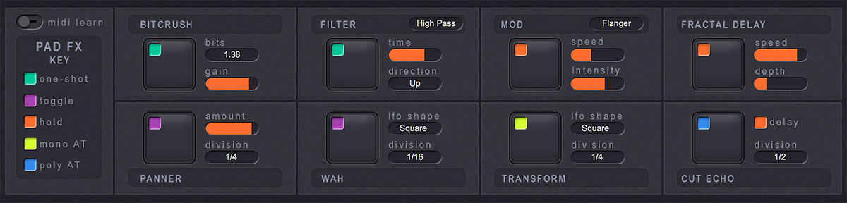 - 8 Playable Pad Effects include Bit Crush, Filter, Mod, Fractal Delay, Pan, Wah, Transform & Cut Echo
