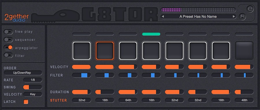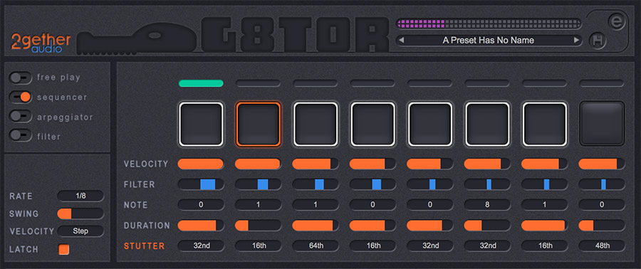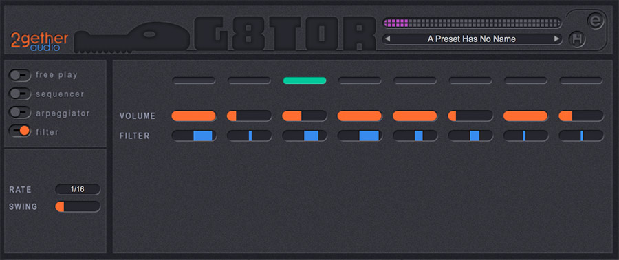 And finally 2getheraudio’s unique 8 step Filter Sequencer animates its resonant filter in perfect time with your music. Like the arpeggiator, just play your chord progression and let G8TOR synchronize your filter movement in perfect time with your DAW tempo. Forget hours of DAW automation programming, G8TOR’s filter sequencer will get you there in minutes.