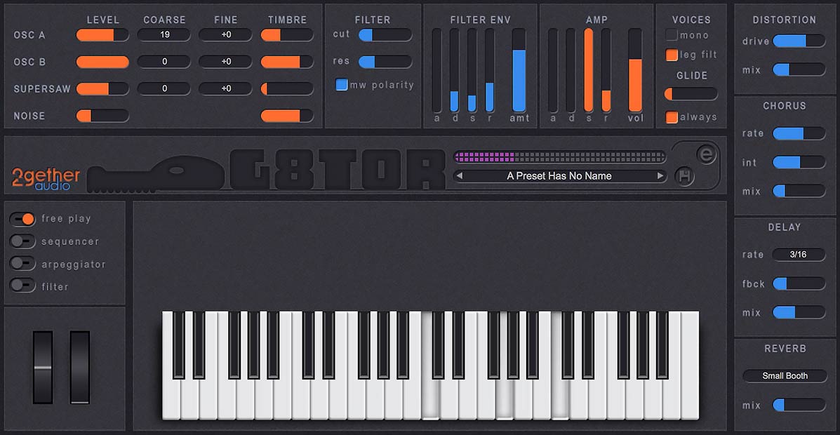 From there our sharp toothed friend gives us a gorgeous Butterworth Filter with envelope control, a 4 stage amplitude envelope, mono mode with portamento and legato control, and four built-in effects including distortion, chorus, delay and reverb.