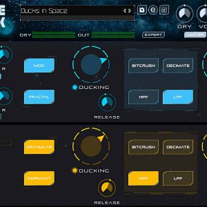 Not your grandma’s reverb. SPACE DUCK features 27 impulse responses alongside bit crushing, decimation, granular and filter effects. Take your reverb to a whole new universe.
