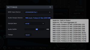 After clicking on the settings button you will be presented the settings window where you can select your audio and midi devices. It looks like this.